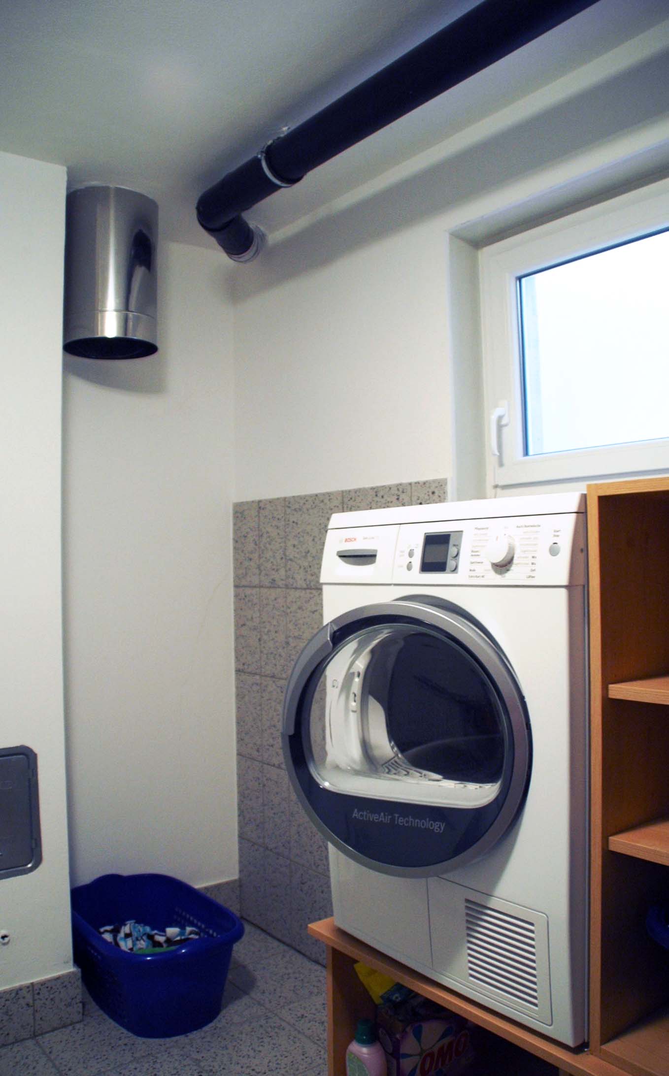 Wenn ein Wäscheschacht in einer Höhe im Untergeschoß endet, dass man sich an diesem scharfkantigen Ende verletzen könnte, so kann man dieses Fallrohr als Endrohr ausbilden. Dabei ist die untere Kante einmal um 180° umgebördelt und damit entsteht ein kleiner runder Wulst.