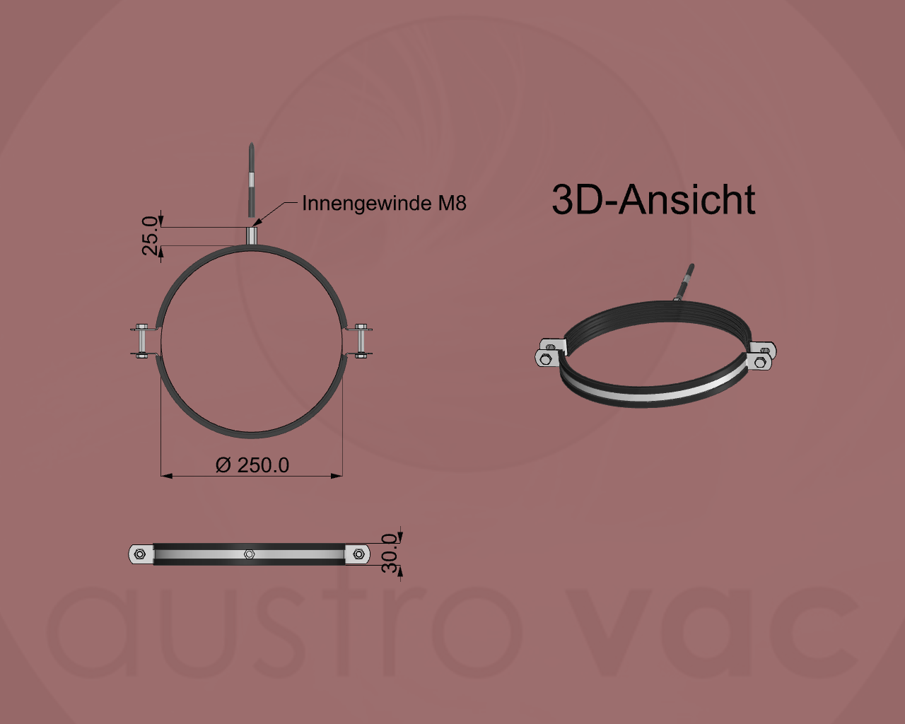 Material bestehend aus: 2-teiliges Stahlband mit Gummieinlage (zur Schallentkoppelung) und 1 Stück M8-Gewinde-Dübelschrauben,