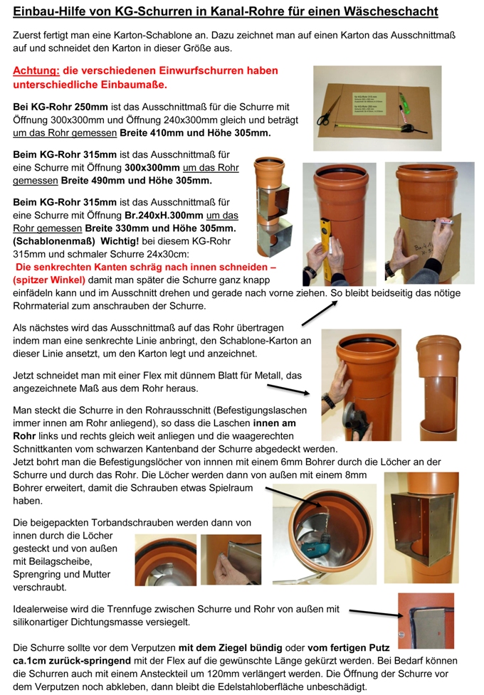 Zu der Anbauschurre wird eine Einbauanleitung beigelegt und die benötigten Torbandschrauben mit denen die Schurre von innen an das Kanalrohr geschraubt wird. Die Ausschnittkanten vom Kanalrohr sind nach der Montage der Schurre nicht mehr sichtbar. (die Schurre verkleidet die Schnittkanten vom Rohr)