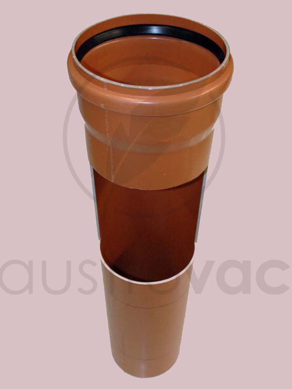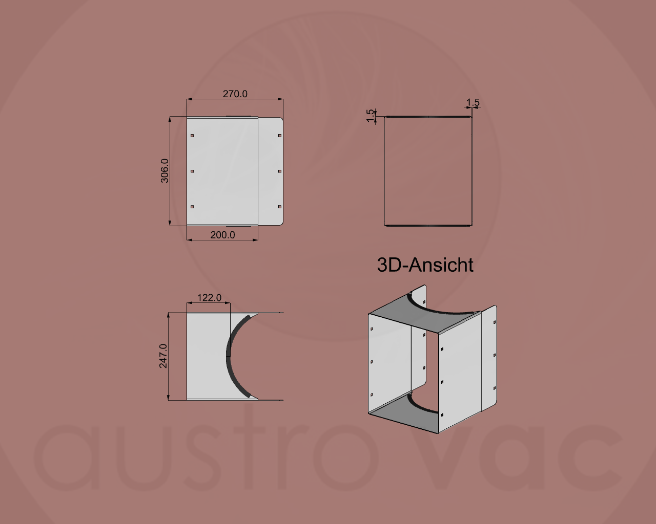 Mit dieser Anbauschurre ermöglicht man den Übergang von einem 250mm KG-Rohr (Kanalrohr) zu einer Wäscheschacht-Abwurf-Türe mit einem eckigen Anschlussmaß von 240x300mm. (der Türrahmen hat dann ein Außenmass von 290x340mm)