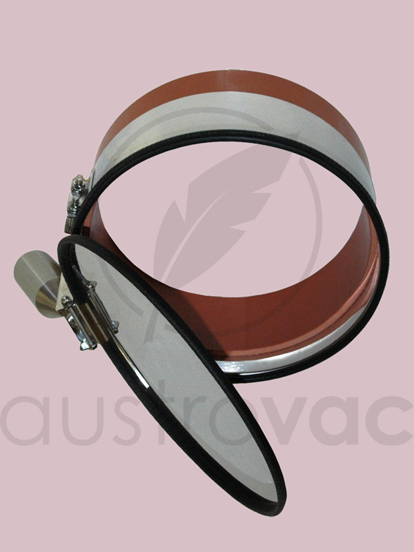 Die Klappe kann an das Schachtende mittels der angebauten Rohrschelle mechanisch befestigt werden. (es wird keine separate Rohrverbindungsschelle benötigt)