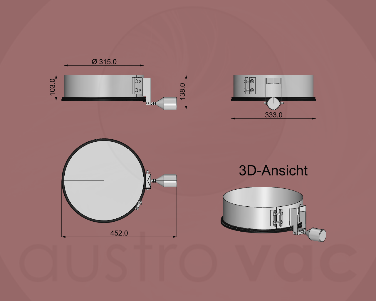 Die Edelstahlklappe kann an ein Kanalrohr KG-30 mit Normdurchmesser außen 315mm angebaut werden.