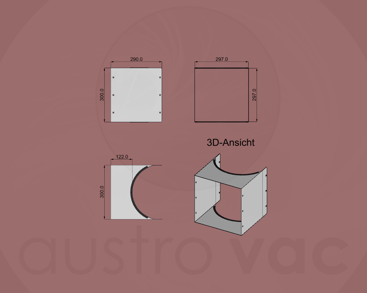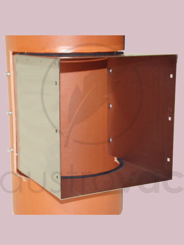 Mit dieser Anbauschurre ermöglicht man den Übergang von einem 300mm KG-Rohr (Kanalrohr) zu einer Wäscheschacht-Abwurf-Türe mit einem eckigen Anschlussmaß von 300x300mm. (der Türrahmen hat dann ein Außenmass von 400x400mm)