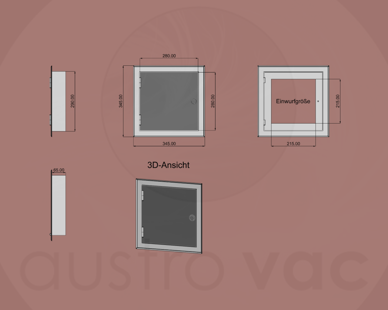 Das bedeutet dass bei einer Türrahmen-Außengröße von 345x345mm mit einem Schurrenanschlussmaß von 290x290mm nur eine Einwurfgröße von 215x215mm (lichte Weite) überbleibt.